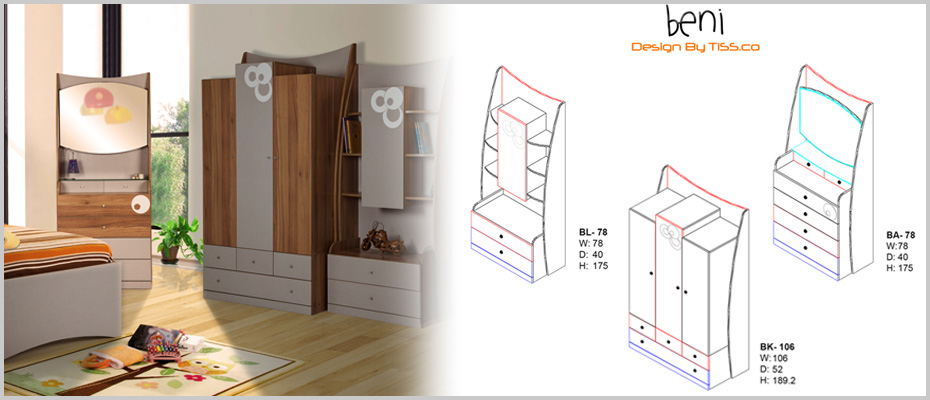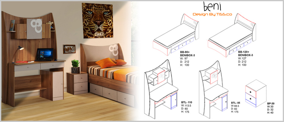 مجموعه نوجوان و جوان سری Beni توضیحات کلی مجموعهای زیبا و کارآمد برای گروه سنی نوجوان متریال تمام MDF تخت دارای سایز ۹۰ و ۱۲۰